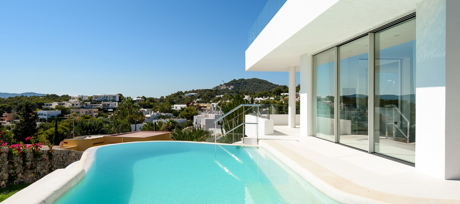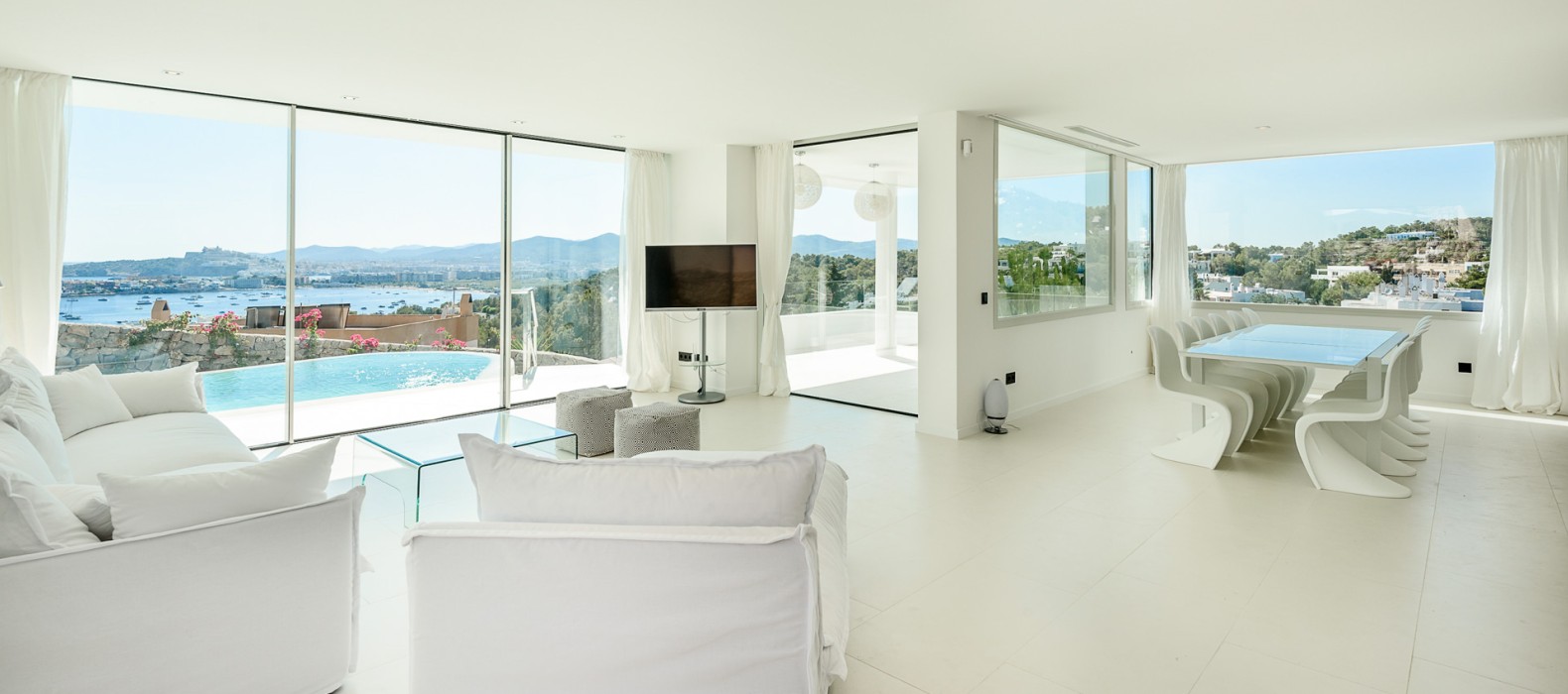 Das mit Toplage gesegnete Haus durfte in den letzten zwei Jahren bereits einige internationale Prominente zu seinen Gästen zählen und wusste jedes Mal auf allen Ebenen zu überzeugen. Schon beim Betreten wirkt die weiße, dreistöckige Villa mit ihren offenen und lichtdurchfluteten Räumen besonders elegant. Nichts überflüssiges lenkt die Aufmerksamkeit von dem gekonnt in Szene gesetzten Ausblick auf die Bucht ab und lässt das Auge bis hin zu Ibizas Altstadt Dalt Vila schweifen. Das Meerespanorama ist voll in den offenen Wohn- und Essbereich integriert. Öffnet man zusätzlich die große Fensterfront, wirkt auch der Infinity-Pool wie ein Teil des Wohnbereiches. Äußeres wird inneres und umgekehrt. Nach einer erfrischenden Abkühlung im Pool lädt der Außenbereich mit zahlreichen Sonnenliegen, Terrassen und Chill Out-Areas zum erholen ein.
