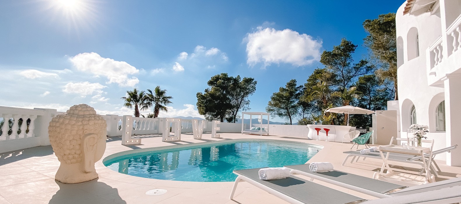 Die Villa The White Pearl thront im Sonnenlicht glitzernd auf dem Gipfel Can Furnets, einer wohlhabenden Gated Community keine zehn Minuten von Ibizas pulsierendem Stadtkern entfernt. Erstmalige Besucher des Anwesens werden durch die endlose Weite des Ausblicks regelmäßig in Erstaunen versetzt. Die perfekt gewählte Lage der Villa The White Pearl lassen Sonnenaufgang und Sonnenuntergang garantiert zum Naturschauspiel werden. Ibiza offenbart sich hier den Gästen des Hauses von seiner besten Seite: magische Farben zeichnen wunderschöne Bilder und surreale Schönheit in den Abendhimmel.