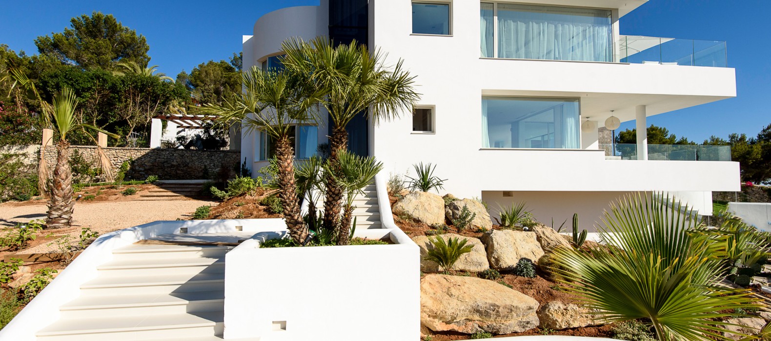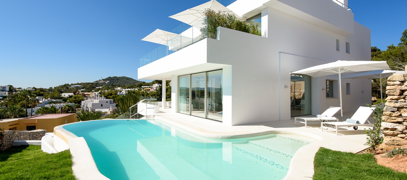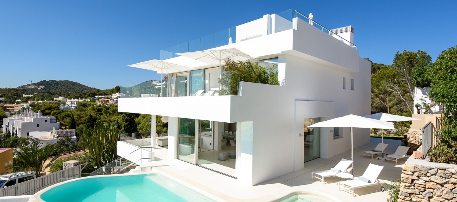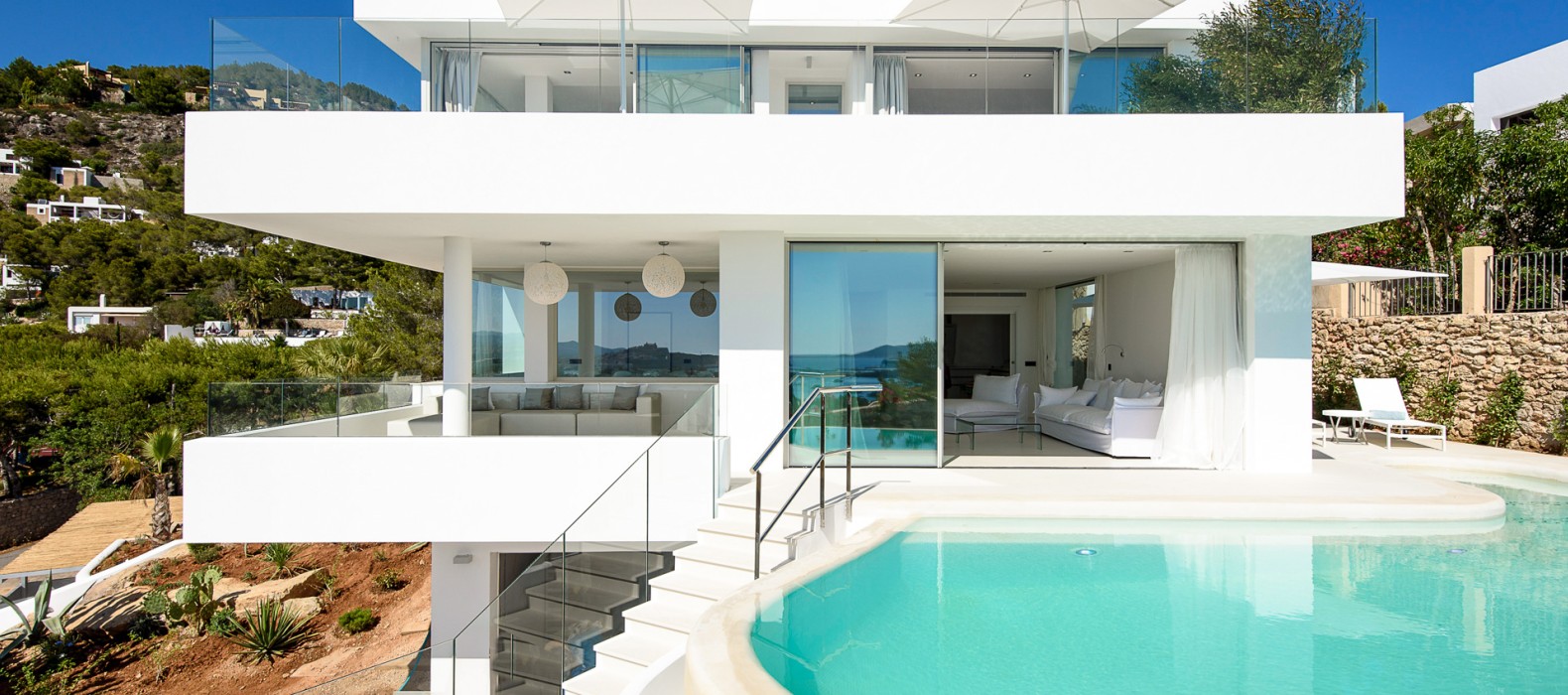 Das mit Toplage gesegnete Haus durfte in den letzten zwei Jahren bereits einige internationale Prominente zu seinen Gästen zählen und wusste jedes Mal auf allen Ebenen zu überzeugen. Schon beim Betreten wirkt die weiße, dreistöckige Villa mit ihren offenen und lichtdurchfluteten Räumen besonders elegant. Nichts überflüssiges lenkt die Aufmerksamkeit von dem gekonnt in Szene gesetzten Ausblick auf die Bucht ab und lässt das Auge bis hin zu Ibizas Altstadt Dalt Vila schweifen. Das Meerespanorama ist voll in den offenen Wohn- und Essbereich integriert. Öffnet man zusätzlich die große Fensterfront, wirkt auch der Infinity-Pool wie ein Teil des Wohnbereiches. Äußeres wird inneres und umgekehrt. Nach einer erfrischenden Abkühlung im Pool lädt der Außenbereich mit zahlreichen Sonnenliegen, Terrassen und Chill Out-Areas zum erholen ein.